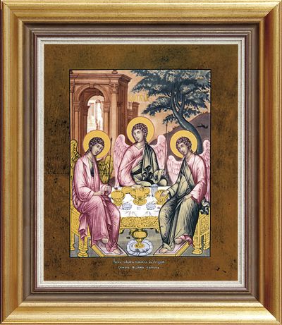 Die alttestamentliche Trinität zeigt die Erscheinung der drei Engel vor dem Palast Abraham und ihre Rast im Schatten der Eiche von Mamre.
